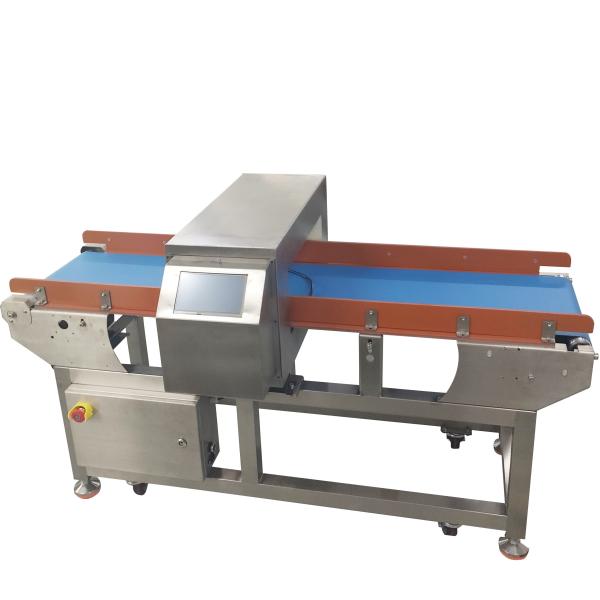 Conveyor belt mechanism with automatic rejecting device or providing alarm signals. Items on the conveyor belt pass through the detector and are automatically rejected or the conveyor is stopped as soon as metal is present. Mainly for in-line inspection of finished and semi-finished products, providing a final check before shipment.